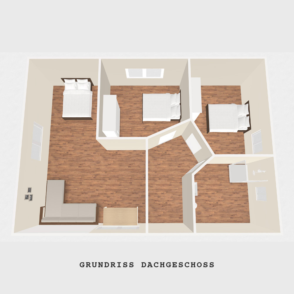 Über die Holztreppe gelangen Sie ins Obergeschoss, wo hochwertiges Echtholzparkett verlegt wurde. Hier befindet sich ein großzügiges Wohn-Schlafzimmer mit Doppelbett und Ecksofa, TV, Schreibtisch mit Lan-Anschluß sowie 2 weitere Schlafzimmer mit Doppelbett und TV. Darüber hinaus befindet sich im Obergeschoss ein Duschbad mit WC und Fön.